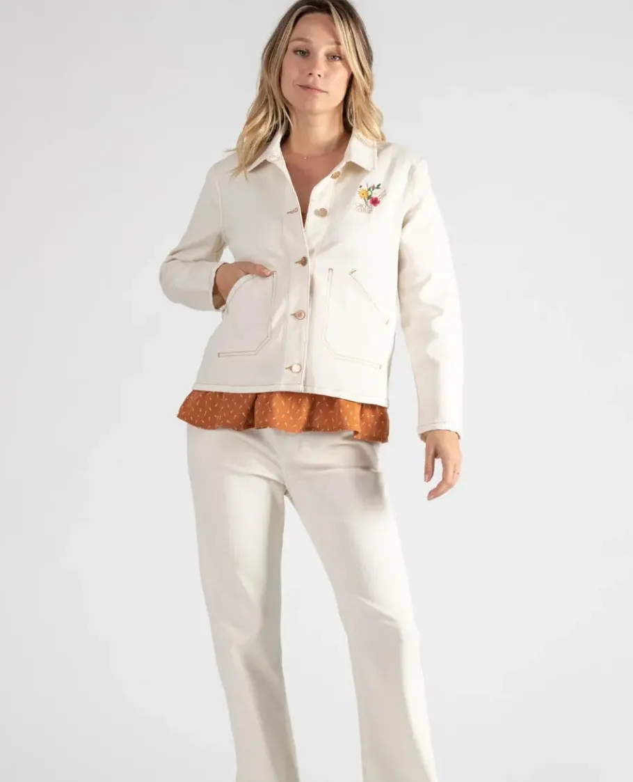 La veste en jean de maternité Romy est un incontournable pour le Printemps-Eté. Reprenant les codes de la petite veste en jean indispensable à votre garde-robe, elle vous séduira avec sa jolie couleur beige et sa broderie fleurie. Sa coupe adaptée vous permet de la porter tout au long de votre grossesse et longtemps après.
